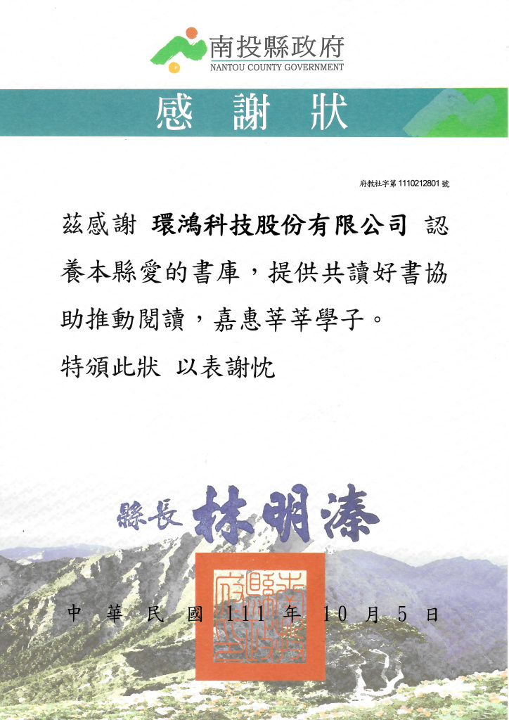 "黄瓜影院" 2022南投縣政府感謝狀–愛的書庫 (臺灣廠)